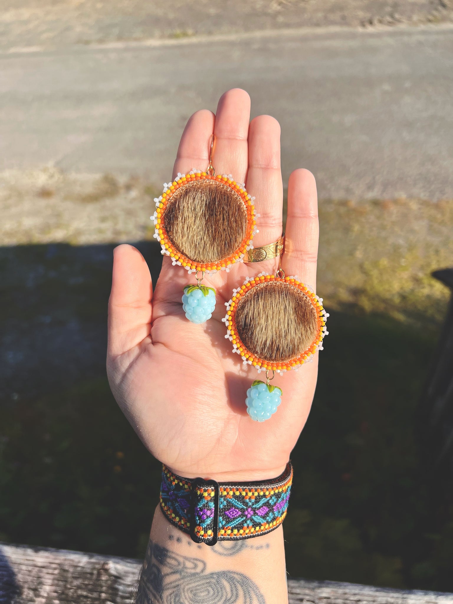 Light wash denim tinted seal pelt beaded with size 11 hyacinth opal, light orange charlottes, and seafoam opal true cuts, backed with buckskin, and fastened with gold plated findings.
