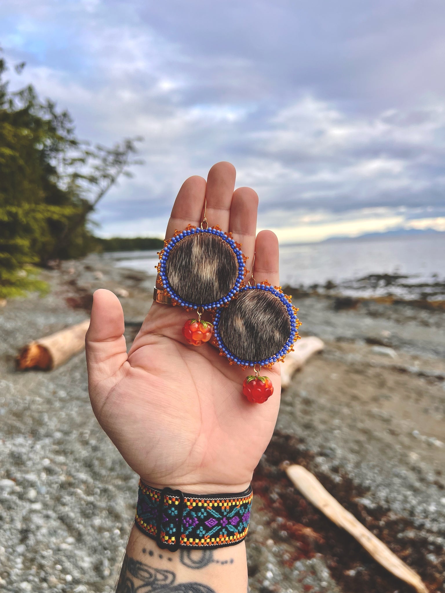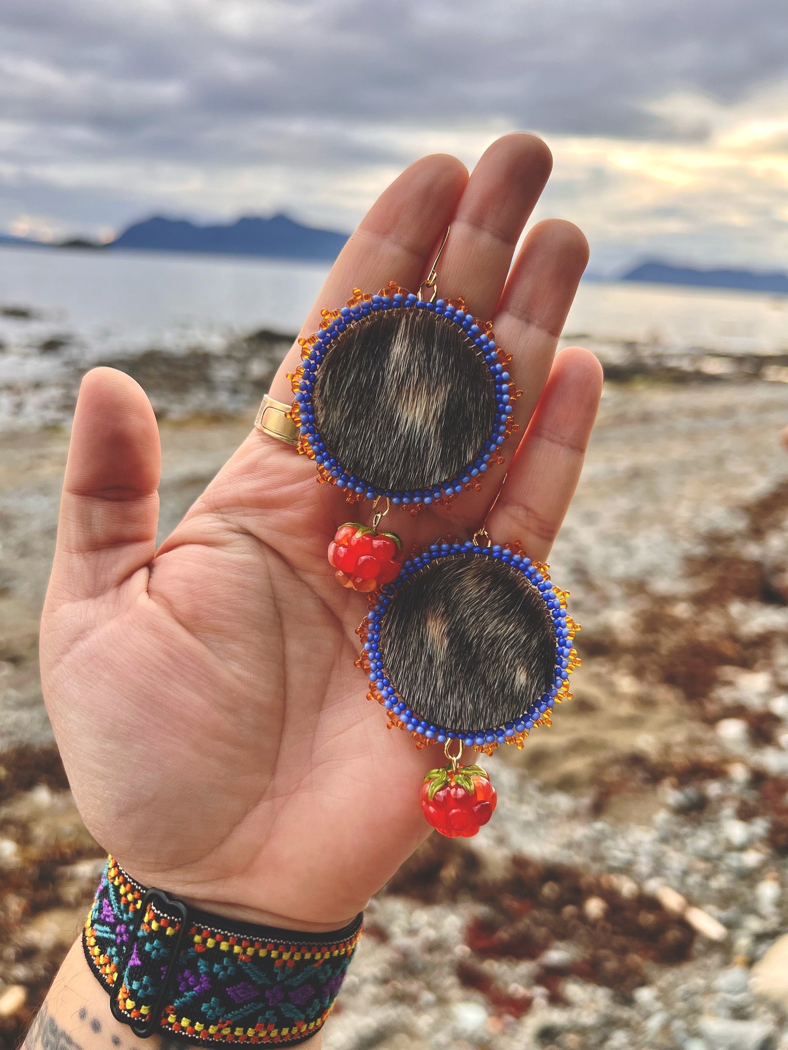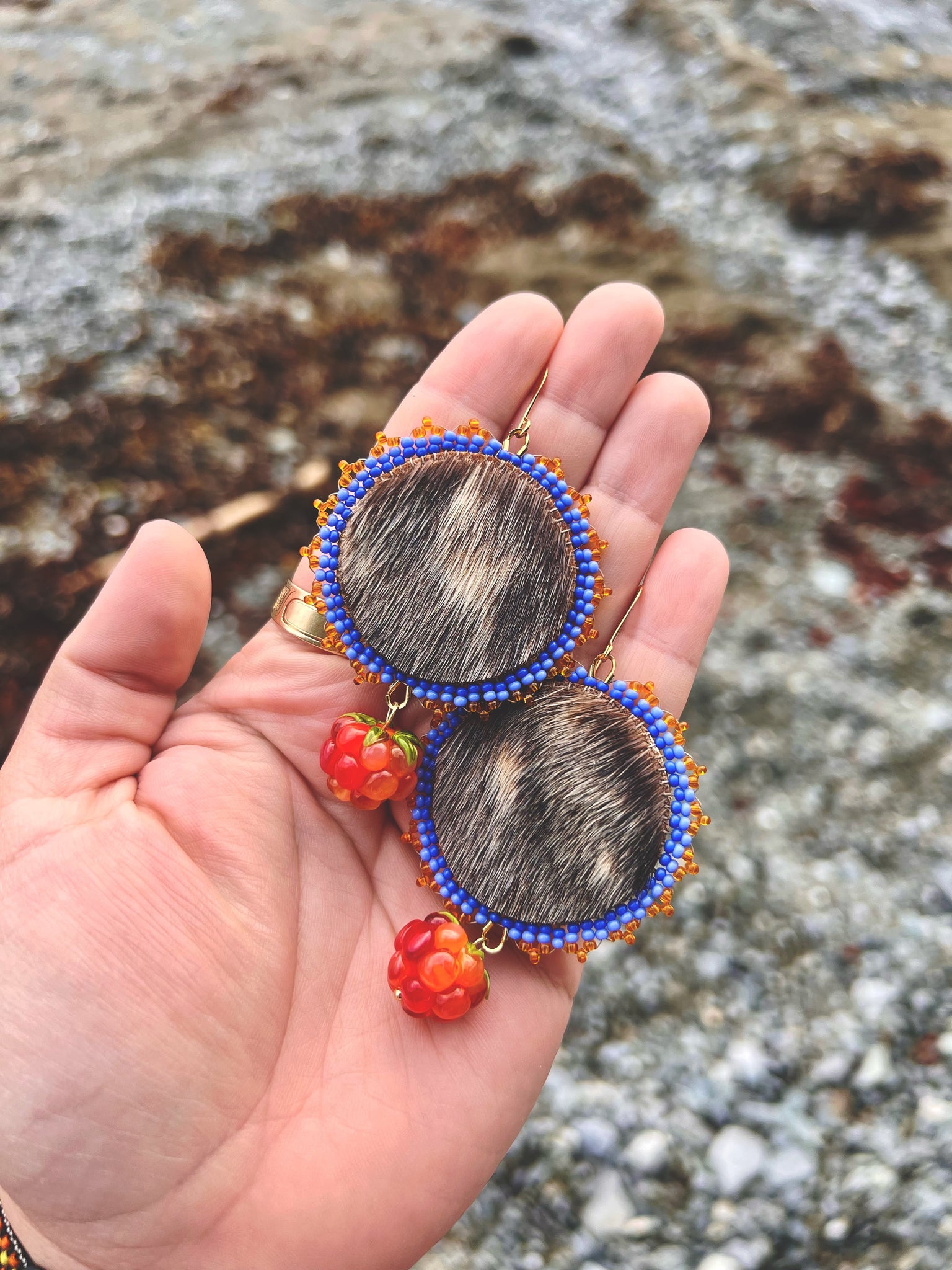 Seal pelt beaded with size 11 delft blue, Charlotte cut light delft blue, and transparent sun Czech seed beads, backed with buckskin, and gold findings.