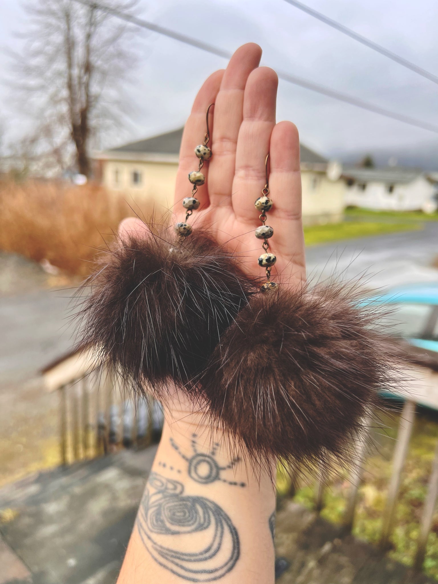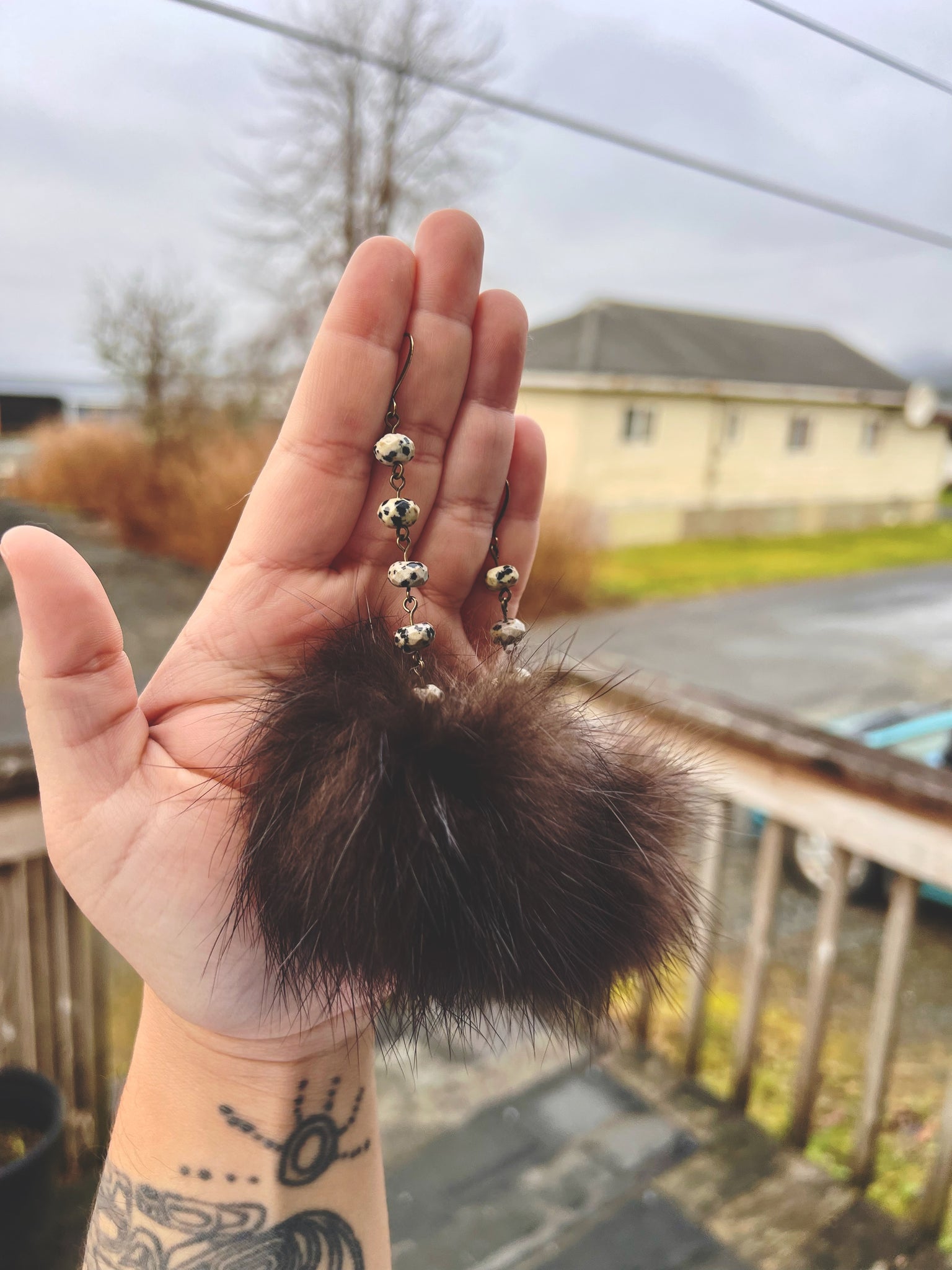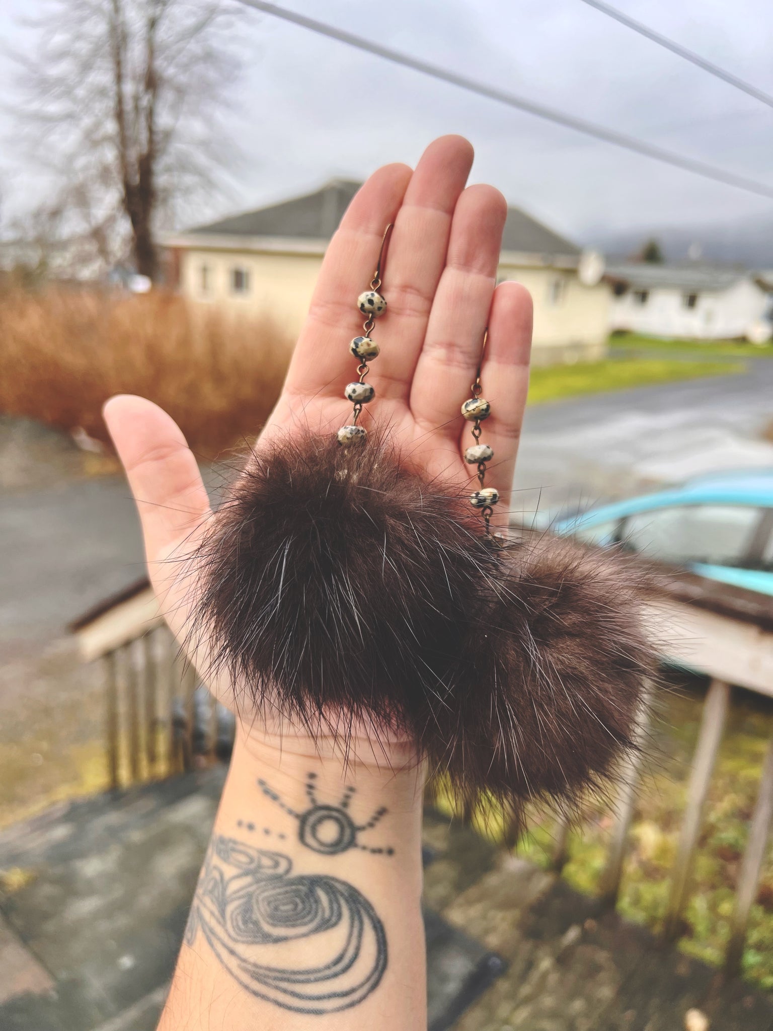 Black-brown beaver pelt fastened with Dalmatian jasper beaded chain with antique brass findings.